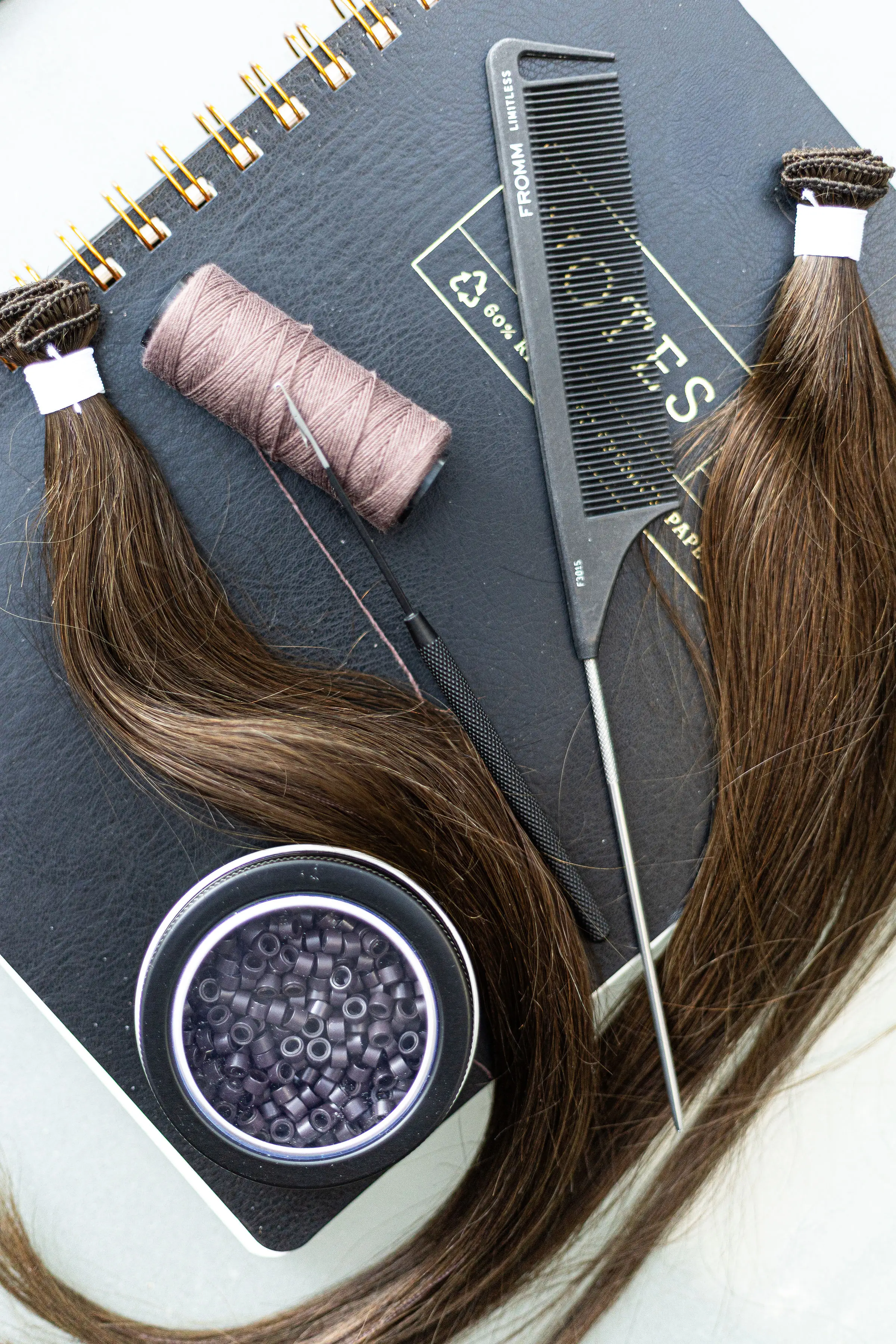 Sew-in beaded weft method designed to add length, fullness, and seamless blend. Beads are used to create a secure foundation, and hand-tied or machine wefts are sewn in for a natural, comfortable finish. This method is gentle on the hair, allows for flexible styling, and is ideal for guests looking for long-lasting volume with minimal damage when properly maintained.